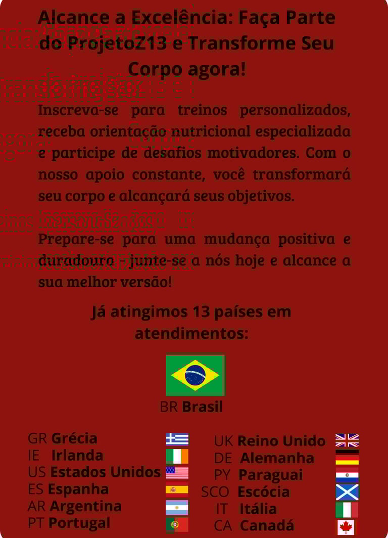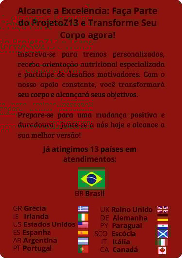A consultoria do projetoz13 mudou minha rotina. Agora me sinto mais forte e saudável, com um plano que realmente funciona para mim.